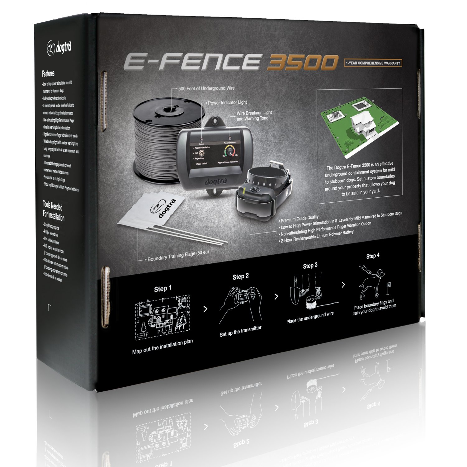 Follow these simple four steps: Step 1 - Map out the installation plan Step 2 - Set up the transmitter Step 3 - Place the underground wire Step 4 - Place boundary flags and train your dog to avoid them