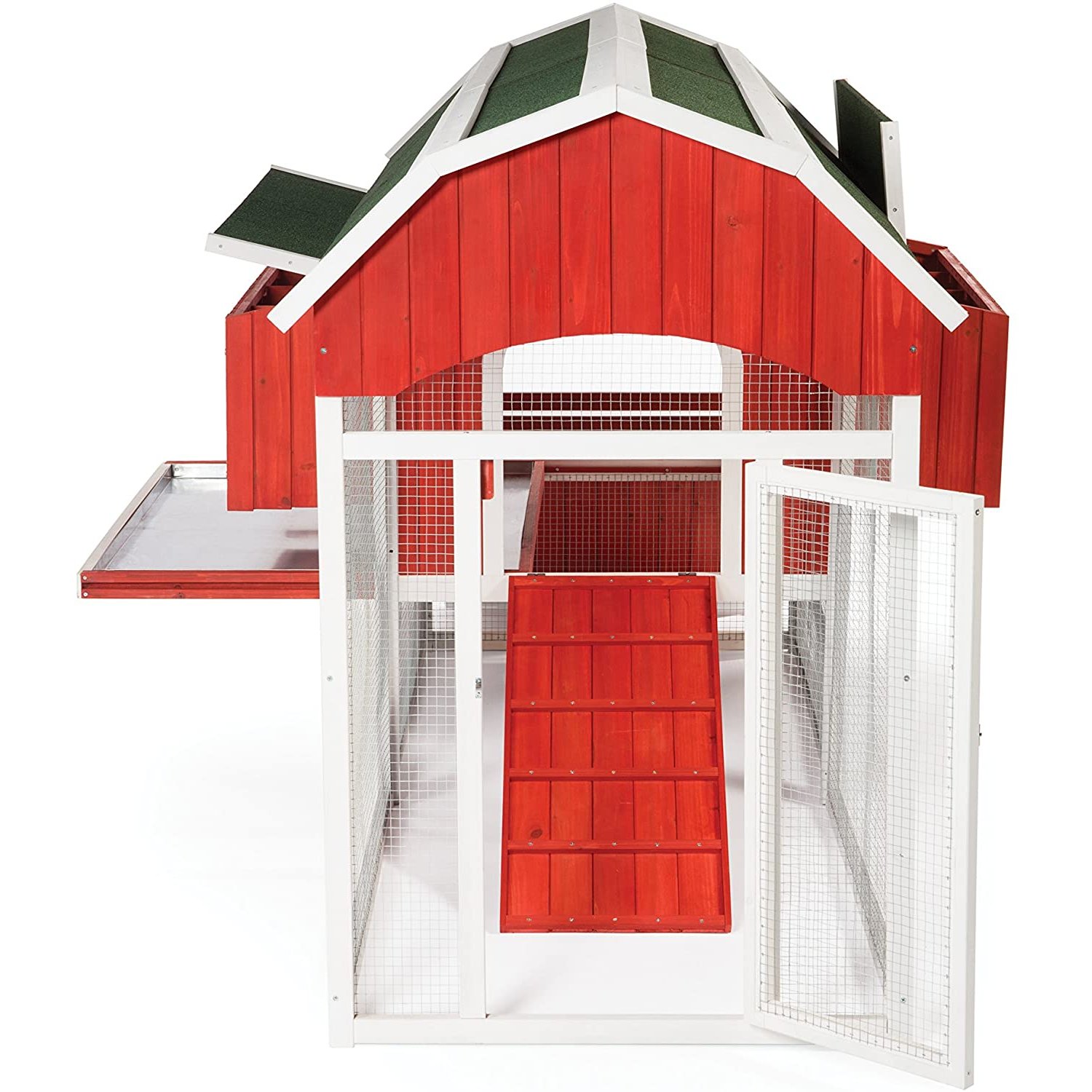 Prevue Pet Products large Red barn chicken coop 467 - inspired by the traditional Red barn found on many farms, our large chicken coop offers lots of living space while remaining compact enough to fit in an urban farm environment. Our thoroughly constructed design combines safety and security for your hens with modern and convenient features for you. There's plenty of room to roam in the protected chicken run while still allowing your flock access to the grass, ground and outdoors. Leave the front access door open for come & go activity or secure with the attached bolt-lock to protect from predators. A ventilated roosting area provides air circulation and light and includes three roosting bars plus an under-coop removable tray for interior cleaning. The large back-panel door gives you full entry to the roosting area and is secured with two bolt-lock closures. Adjacent to the roosting area, two nest boxes contains four nesting slots with each slot measuring approximately 9 ╜ö in width. Nest box lid lifts easily, or can be fully removed, for egg removal and can also be locked for additional security. Spacious enough for 8 û 10 hens, a traditional barn Red, non-toxic, stain is complimented by a green asphalt roof to keep the coop's interior cozy and dry. Heavy enough to prevent predators from lifting it, but easy enough for two people to Reposition. Prevue Pet Products large chicken coop 467 is easily assembled and includes step-by-step instructions. To maintain the longevity of your purchase, we recommend that you periodically treat it with a non-toxic sealant, and protect it with a tarp or other covering during extended periods of inclement weather. Coop measures 90 1/2'' long, 54''wide and 51 1/2'' high.