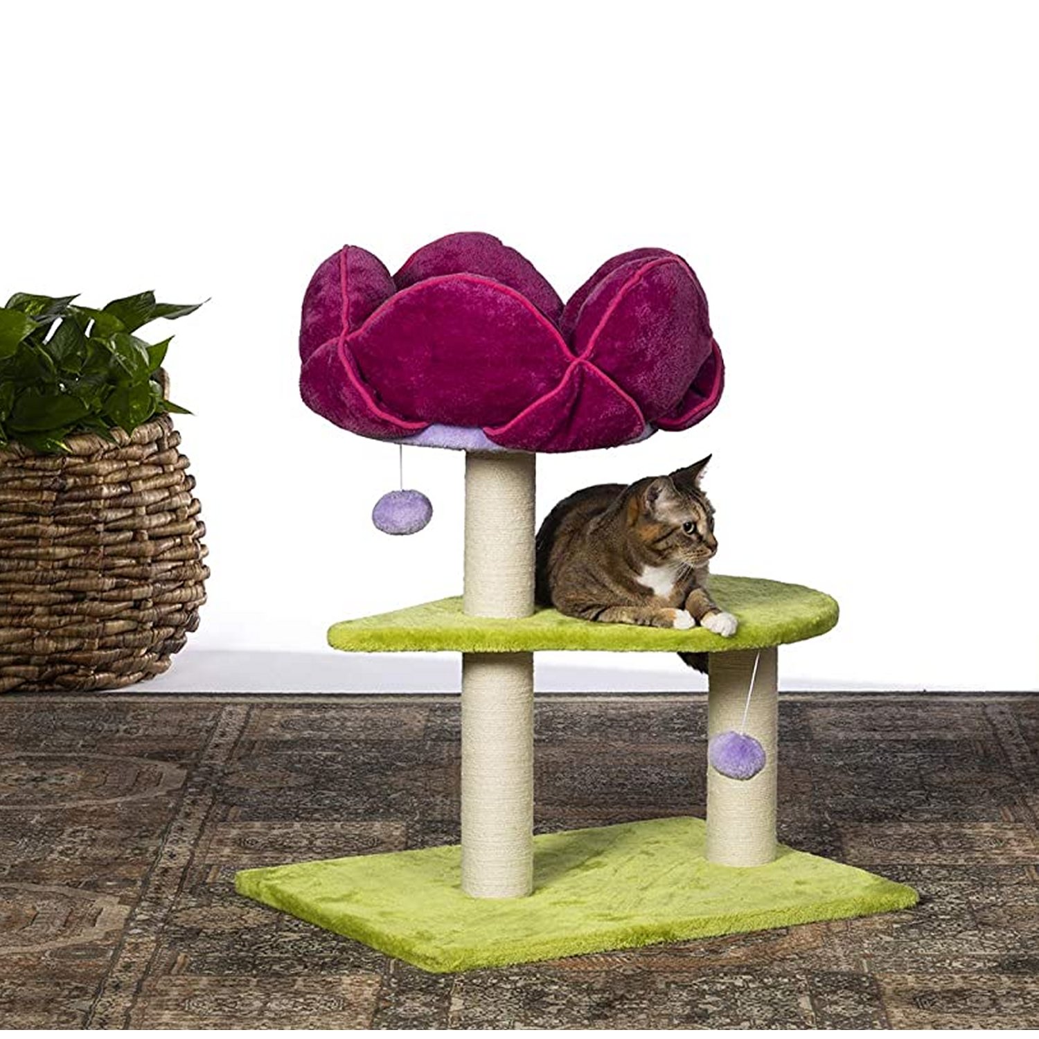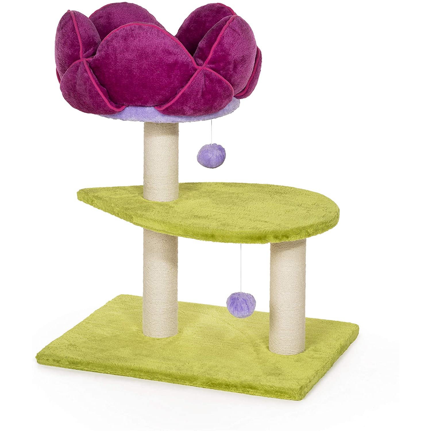 Prevue Pet Products Flower Power 7320 combines super soft, plush fabrics with durable jute to provide the perfect place for your cat to sleep, lounge and play. Two plush, dangling swat toys and lounging platform provide opportunities for pouncing and jumping. Two individual, natural, jute rope scratching posts offer an appealing texture to cats, curbing inappropriate scratching behaviors. Our incredibly plush flower bed encompassed in velvety soft pillows to surround your feline in total comfort while making your cat or kitten feel more secure and less vulnerable to sneak attacks. Our whimsical flower design in bold shades of fuchsia and lime green is sure to add a delightful presence to any room. Prevue Pet Products Flower Power 7320 measures 23.5 inches Long, 17.75 inches Wide, and 28.12 inches High.