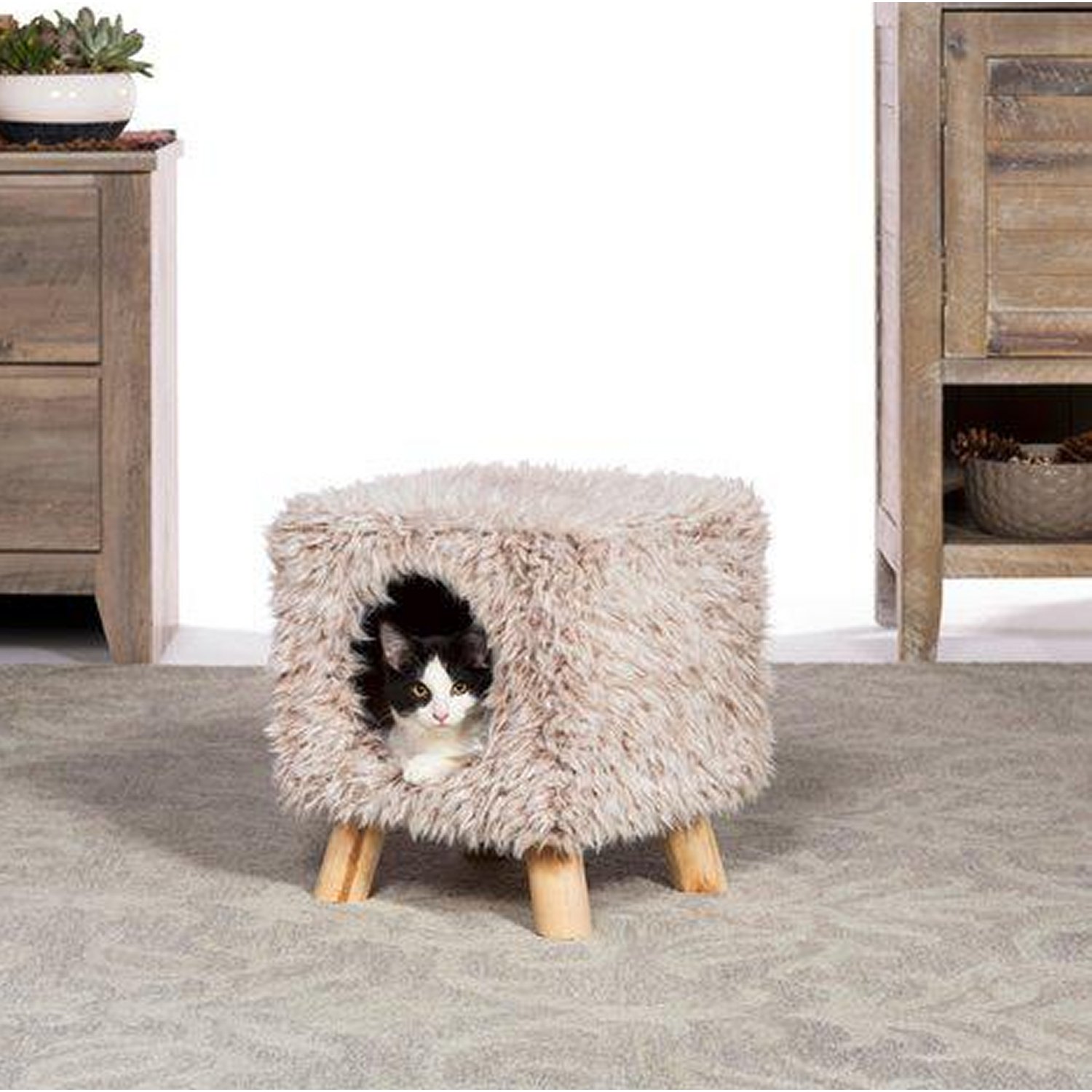 Prevue Pet Products Cozy Cube Frost Tan 7380 is a comfy and stylish hideout for your cat or small dog. Ultra-soft, plush, shaggy tan fabric covers the cube and interior floor, providing a covered hideaway where your cat or kitten will feel more secure and avoid social stress. Your pet will love lounging, sleeping or surveying their surroundings from the top of the cube. Frost Tan fabric combined with light colored wooden legs lends a furniture feel, ensuring this cat condo will complement your décor. Our Tan Cozy Cube measures 12'' long, 12'' wide and 13 ½'' high with a 7'' diameter hideaway opening. Great for pets and kids. Weight limit of 100 lbs.